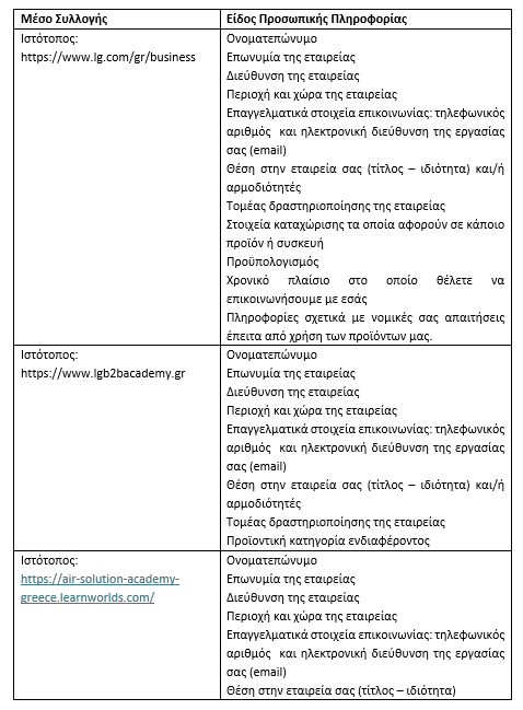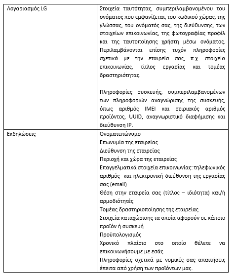 · μόνον για όσο είναι απαραίτητο για τον σκοπό για τον οποίο έχουν συλλεχθεί, υποβληθεί σε επεξεργασία ή για μεγαλύτερο χρονικό διάστημα, εάν αυτό απαιτείται δυνάμει κάποιας σύμβασης, από ισχύον νόμο, ή σε ανωνυμοποιημένη μορφή, για στατιστικούς σκοπούς, υπό την προϋπόθεση κατάλληλων δικλείδων ασφαλείας. Για παράδειγμα, εάν προκύψει κάποια διένεξη ανάμεσα σε εσάς και τον Όμιλο LG ή εάν δεν καταφέρετε να κάνετε μία πληρωμή, μπορεί να διατηρήσουμε σχετικές πληροφορίες μέχρι να επιλυθεί η εν λόγω διένεξη ή μέχρι να γίνει πληρωμή, αντίστοιχα. Εάν διαγράψετε ολόκληρο των Λογαριασμό LG σας, οι πληροφορίες σας θα διατηρηθούν για τρεις μήνες και αμέσως μετά θα καταστραφούν, εκτός κι αν απαιτείται διαφορετικά από το ισχύον δίκαιο.